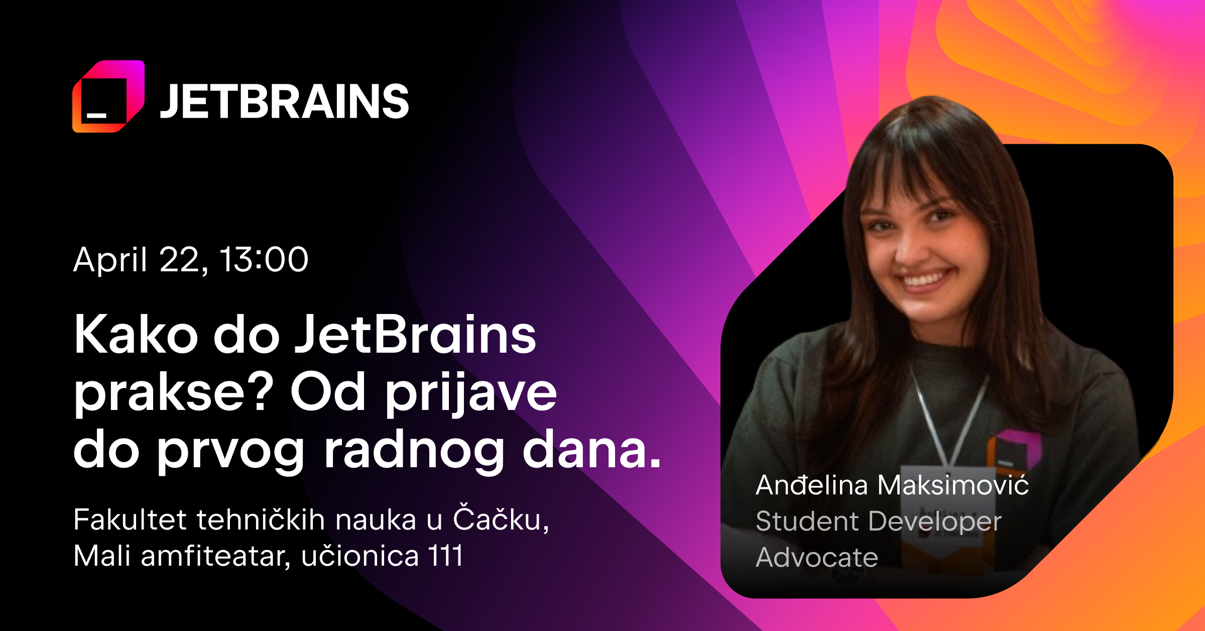 Predavanje će održati Anđelina Maksimović (Student Developer Advocate), koja će sa studentima podeliti iskustvo o procesu prijave, intervjuima i prvom radnom danu u kompaniji JetBrains.
